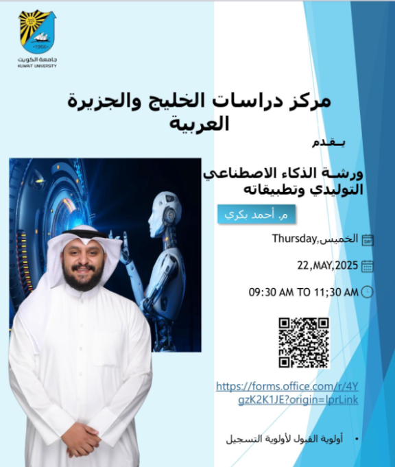 ورشة "الذكاء الاصطناعي التوليدي وتطبيقاته" التي سيقيمها مركز دراسات الخليج والجزيرة لعربية في يوم الخميس الموافق ٢٢.مايو.٢٠٢٥.