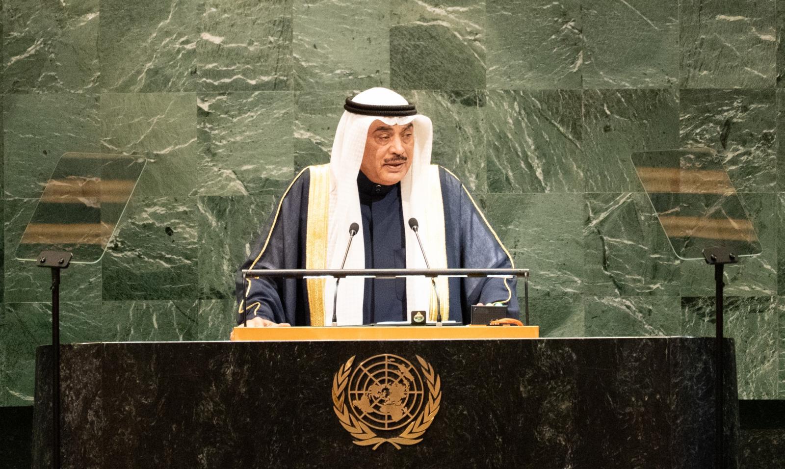 في البداية يسرني أن أنقل لكم تحيات حضرة صاحب السمو أمير دولة الكويت الشيخ مشعل الأحمد الجابر الصباح حفظه الله ورعاه وتمنيات سموه رعاه الله بنجاح أعمال الدورة الثمانين للجمعية العامة للأمم المتحدة وأتقدم إليكم – السيدة الرئيس – وبلدكم الصديق بالتهنئة لانتخابكم رئيسا للجمعية العامة للأمم المتحدة كما أشيد بالجهود التي بذلها سلفكم السيد فيليمون يانغ خلال رئاسته للدورة السابقة لأعمال الجمعية العامة ولا يفوتني أن أثمن عاليا القيادة الحكيمة لمعالي الأمين العام السيد أنطونيو غوتيريش وأغتنم هذه المناسبة لأجدد دعم دولة الكويت المتواصل له ولجهوده الجريئة والحميدة في إنفاذ الأهداف والرسالة السامية للأمم المتحدة.
