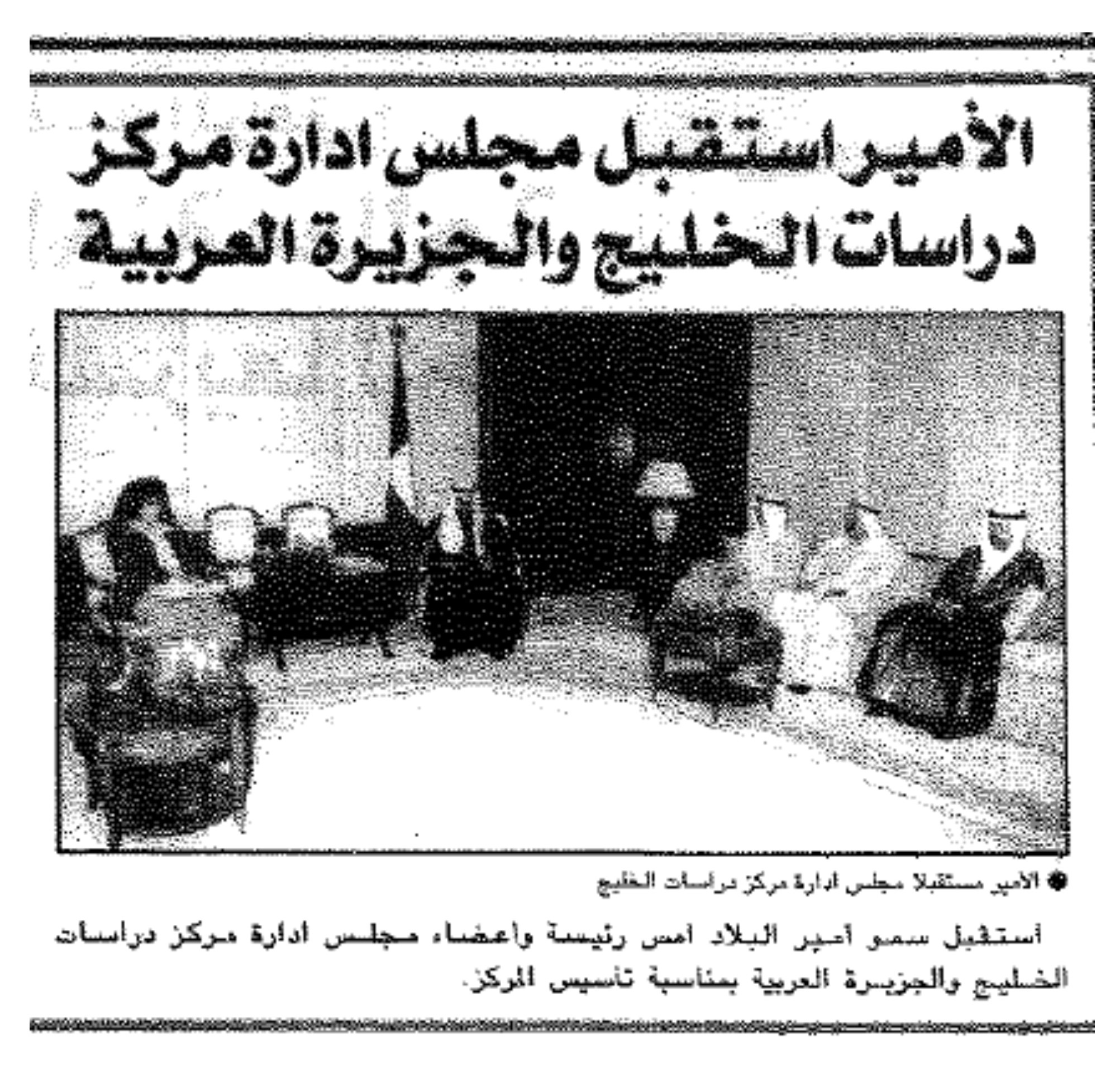25.مارس.1996صورة استقبل سمو الأمير الشيخ جابر الأحمد الجابر الصباح أمس رئيسة وأعضاء مجلس ادارة مركز دراسات الخليج والجزيرة العربية بمناسبة تأسيس المركز.جريدة القبس - العدد 8173 شارك